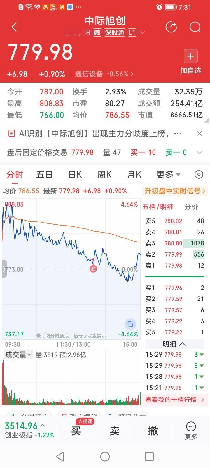 中际旭创,尾巴上翘也要收涨!中际旭创今天随大盘高开低走,股价在临近收盘一度翻绿,可在14:46分开始,股价来了一记神奇的倒挂金钩,上涨0.90%,翻红了。