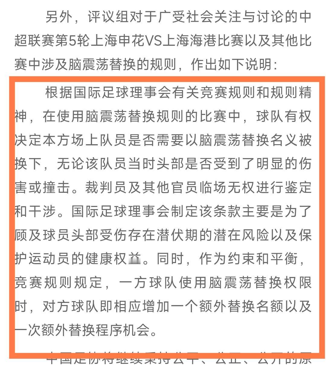 今天足协发布了最新一期的裁判评议报告,其中对于上海海港球员杨世元脑震荡一事,也做出了专门的回应。报告明确表示,上海海港及球员杨世元的举动,完全符合比赛规则的要求。上海海港有权自行判断和决定球员是否存在脑震荡风险,并按规则提出换人,裁判员无权干涉。