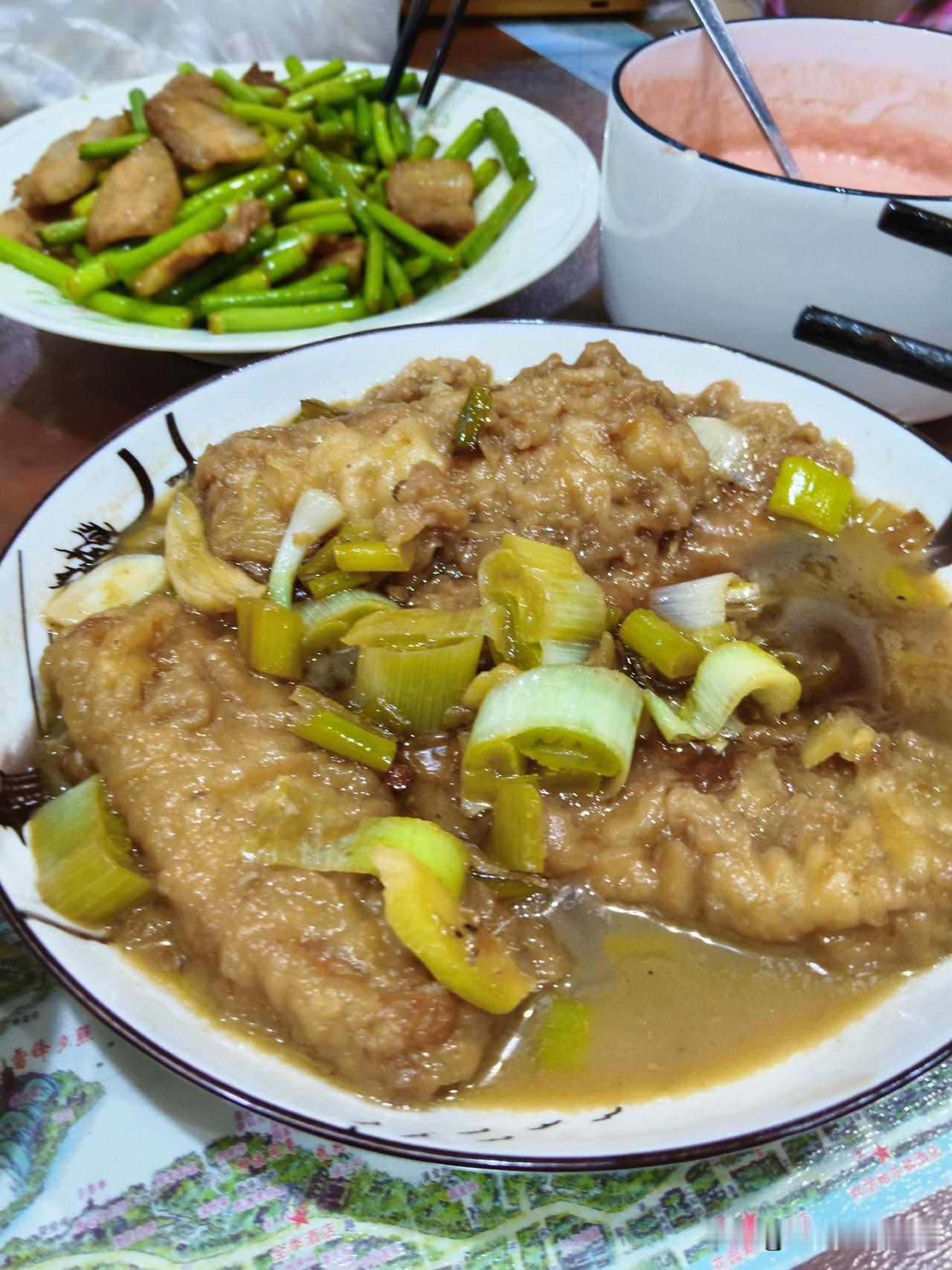 中午她做了几个陈年旧菜,被我调侃,秦始皇的熏肠,汉武帝的熏鸡,唐太宗的大虾,宋太祖的包子,颇感内疚,晚上准备了两新菜——蒜薹炒肉,炸鱼下汤儿。主食是新蒸的米饭。