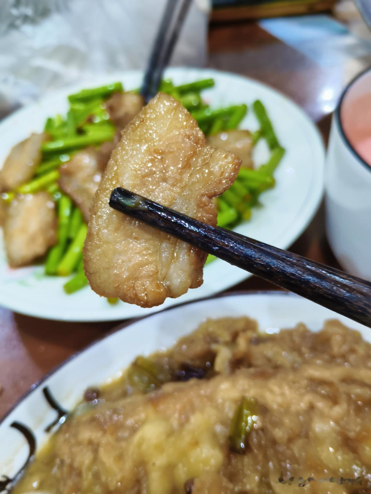 新蒜薹炒五花肉好吃,红烧带鱼好吃,就着一碗米饭。