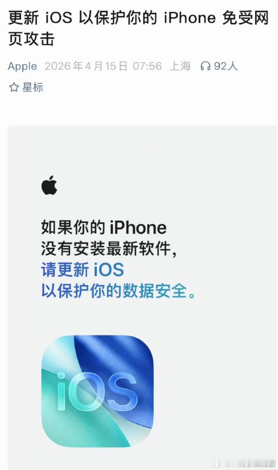苹果罕见发布催更提醒 刚刚,苹果通过公众号发布紧急安全提示。核心意思就是:如果你