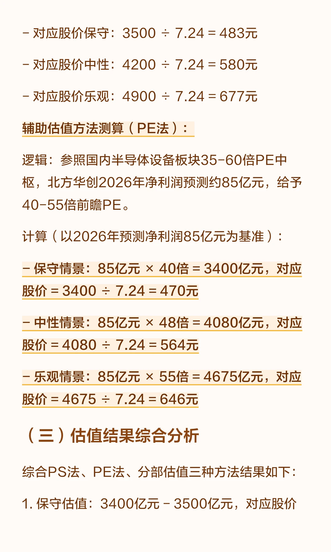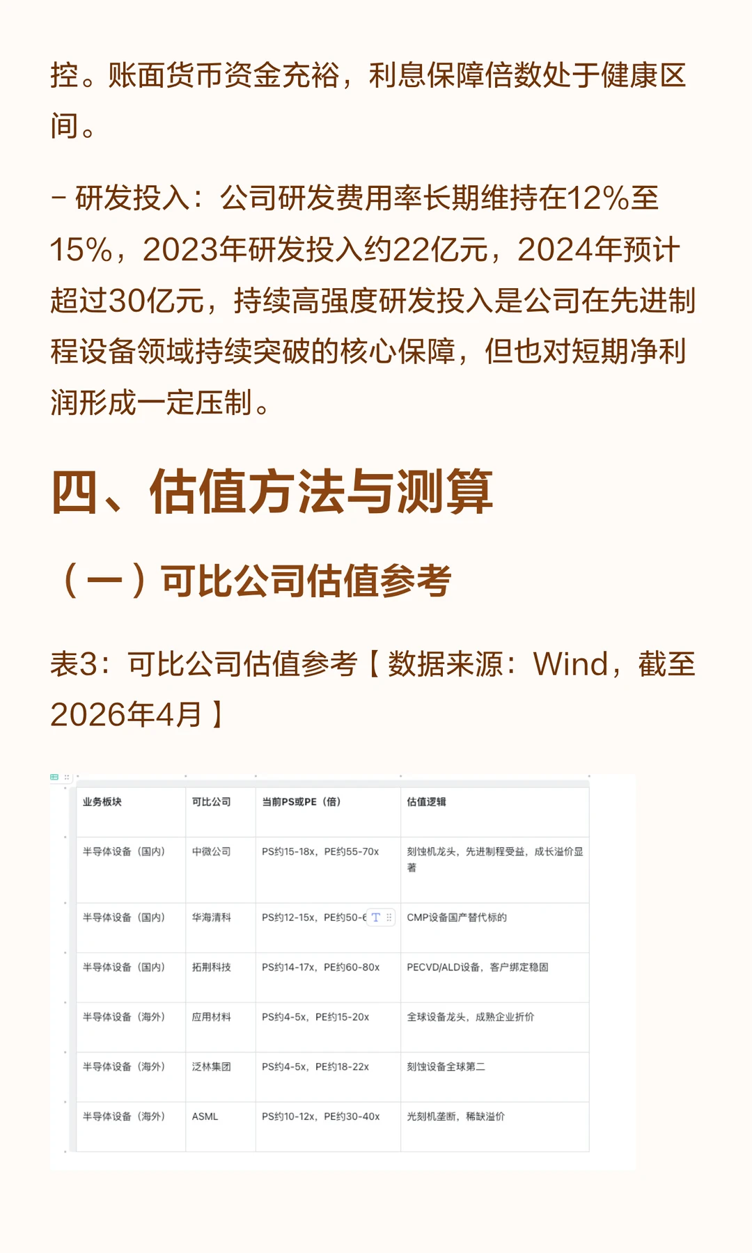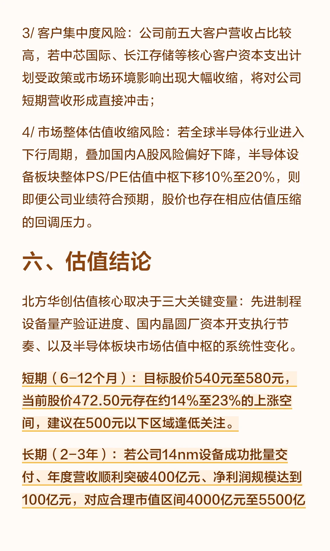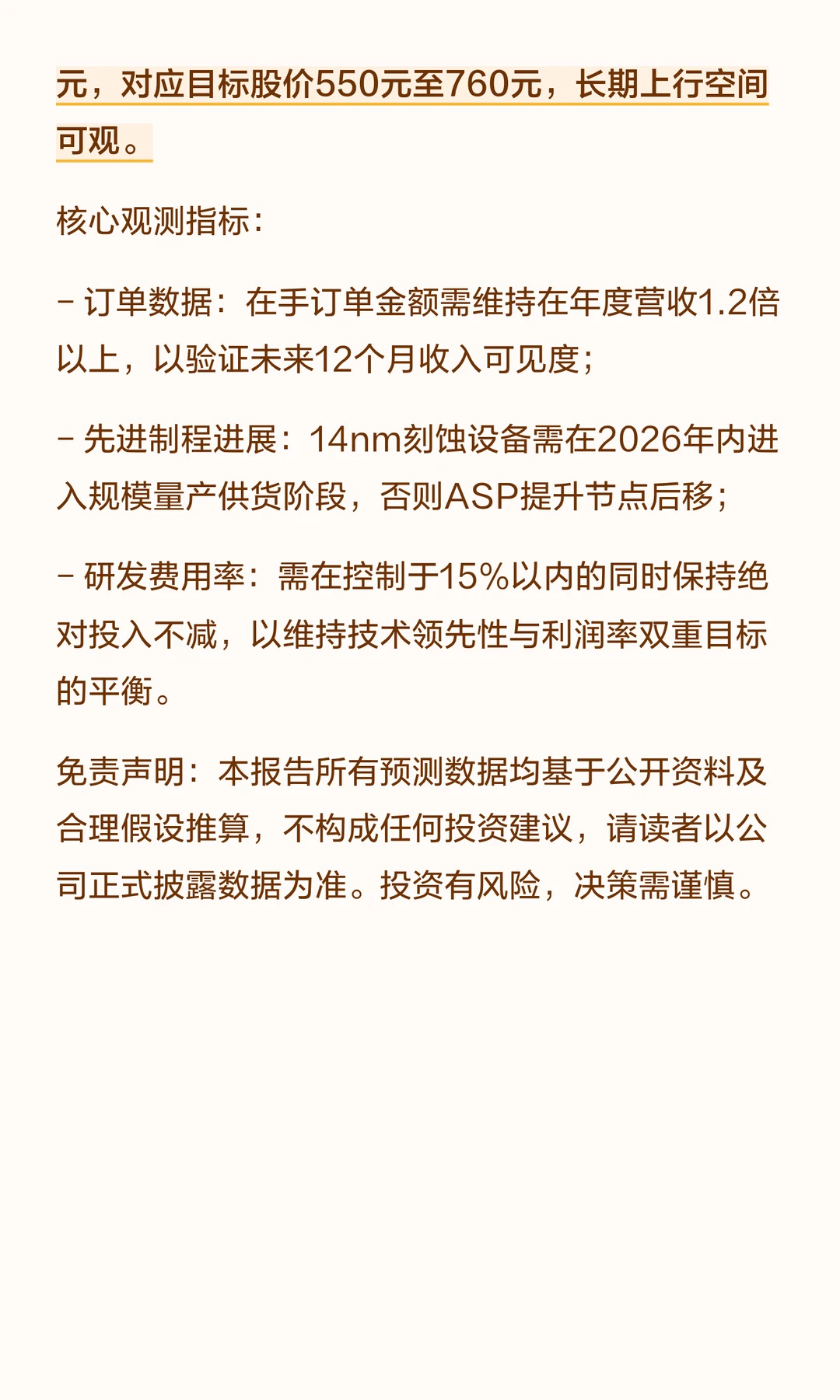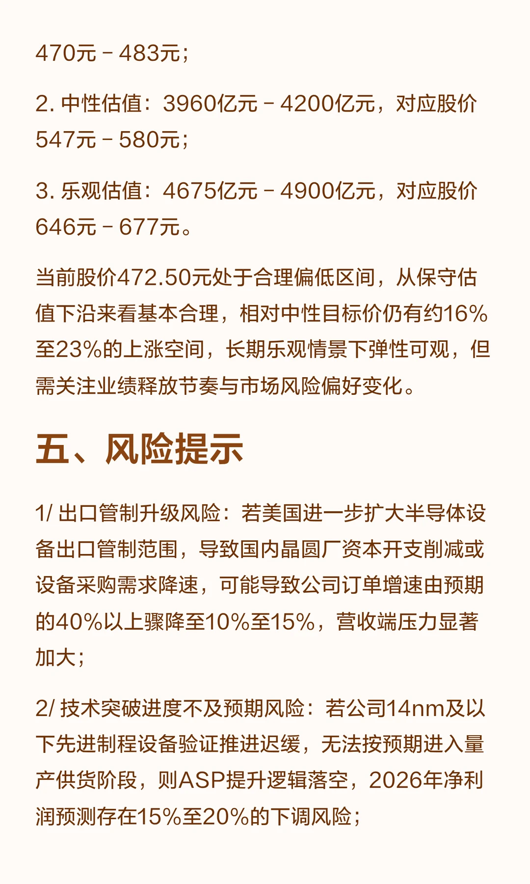 [二R]长期(2-3年):若公司14nm设备成功批量交付、年度营收顺利突破400亿元、净利润规模达到100亿元,对应合理市值区间4000亿元至5500亿元,对应目标股价550元至760元,长期上行空间可观。
