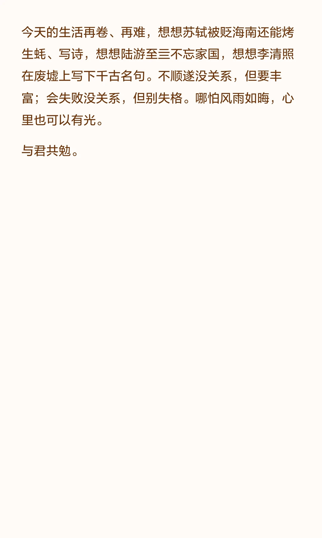 今天的生活再卷、再难,想想苏轼被贬海南还能烤生蚝、写诗,想想陆游至死不忘家国,想想李清照在废墟上写下千古名句。