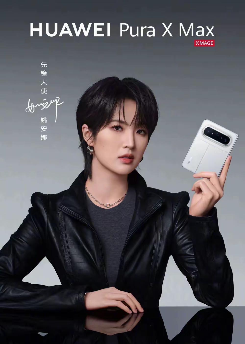 4月15日官宣,姚安娜再度代言华为Pura X Max,和王安宇搭档当先锋大使。