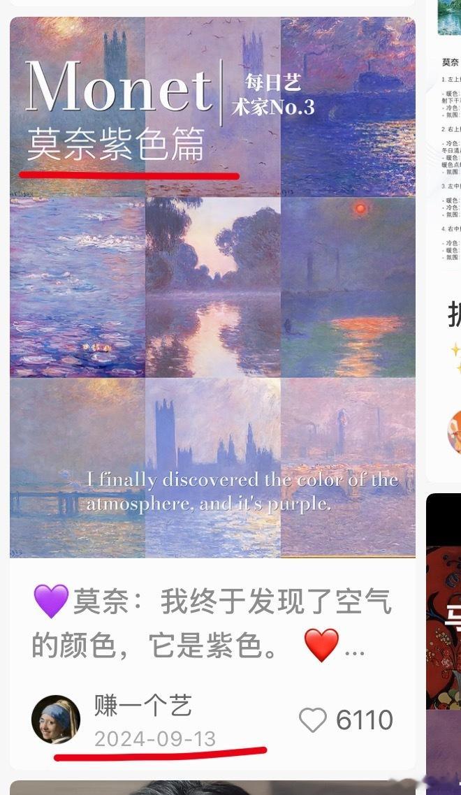 有一说一,莫奈是真的很喜欢用紫色,很会用紫色,这个词在中文互联网也一直都有(p1p2) ,但凡了解一点莫奈,都不会对这个词陌生,并不是为了博眼球生造的。