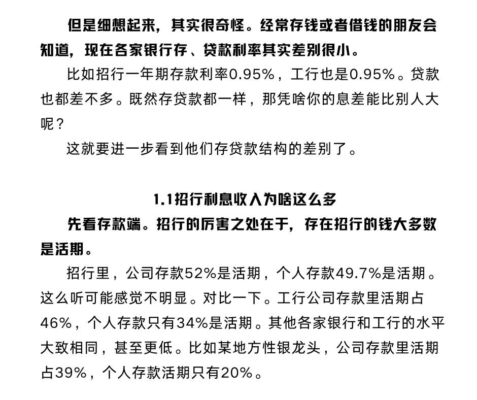 公司存款52%,个人存款49.7%是活期。而工行公司存款里46%,个人存款34%是活期。其他银行甚至更低。活期越多当然省的越多。