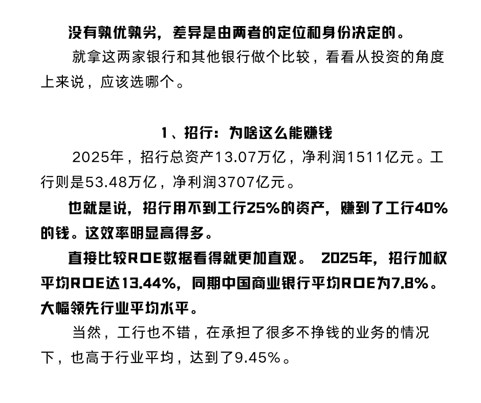 2025年,招行总资产13万亿,净利润1511亿元。工行53万亿,净利润3707亿元。