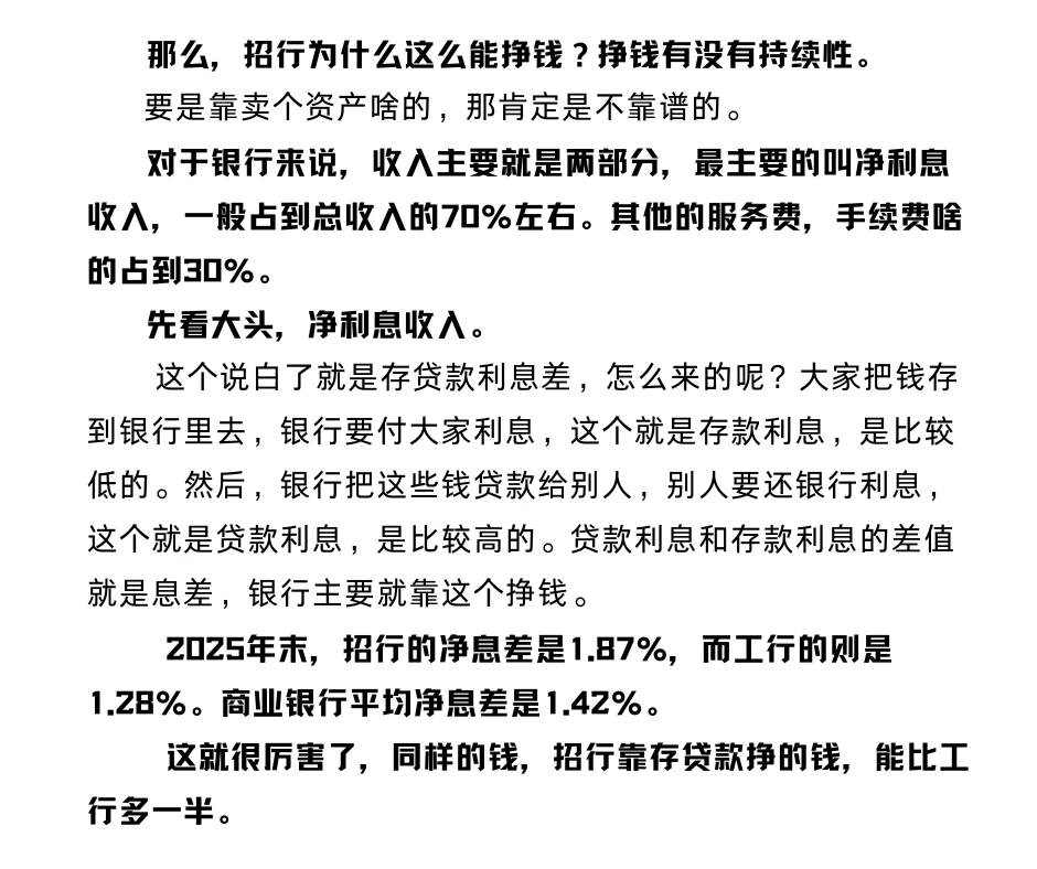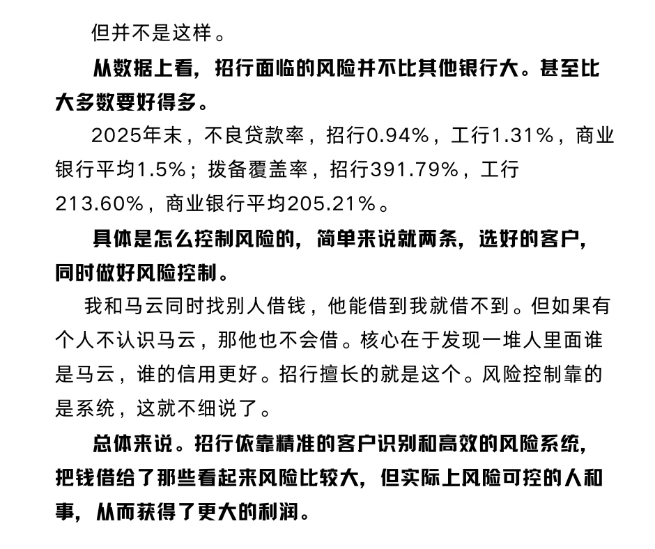 看似危险,但实际上的风险并不比其他银行大。2025年末,不良贷款率,招行0.94%,工行1.31%,商业银行平均1.5%;拨备覆盖率也很好。