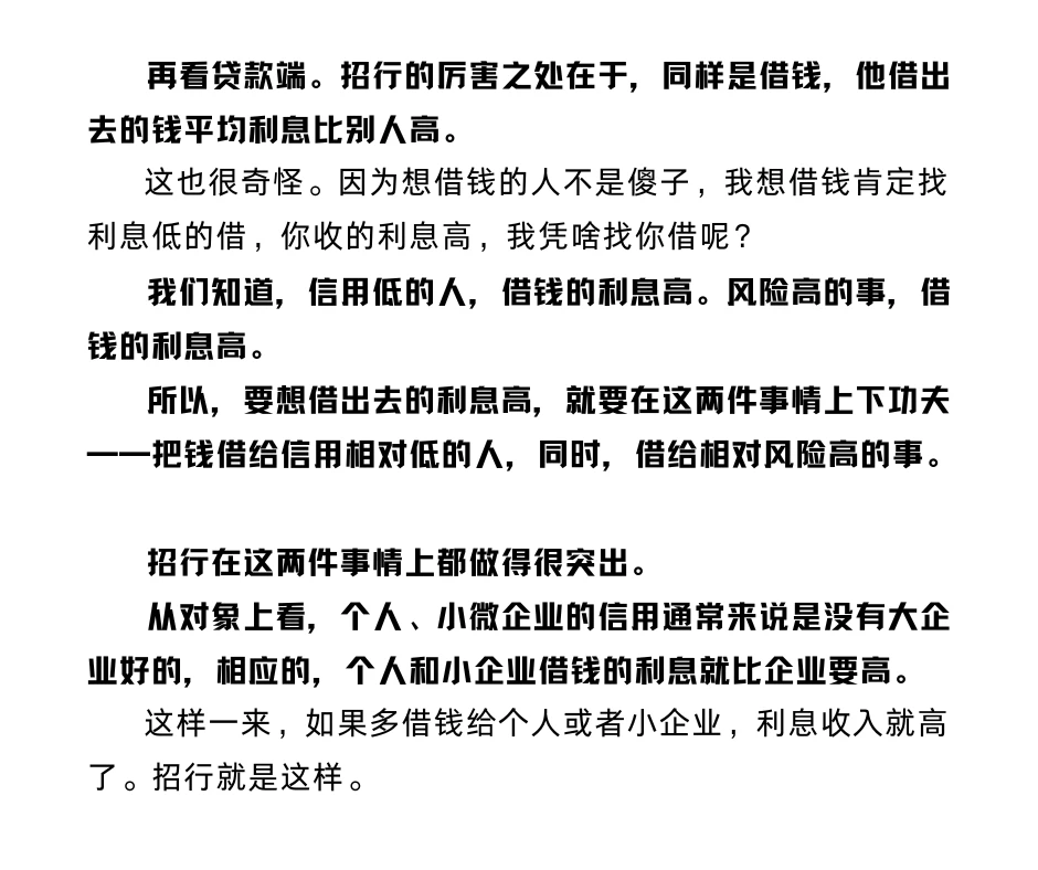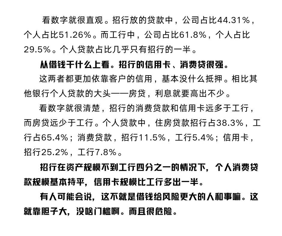 看数字就很直观。招行放的贷款中,个人占51.26%。而工行的个人占29.5%。