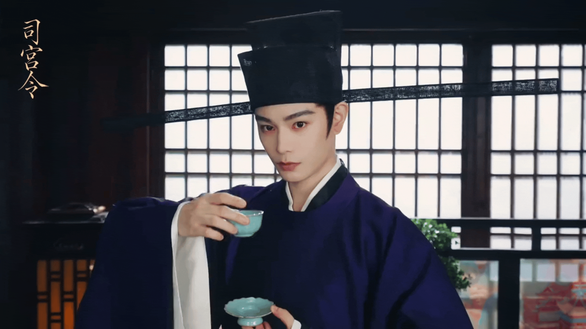 丁禹兮司宫令里的这个帽子正面看竟然这么长,怪不得他必须侧着头才能离开房间