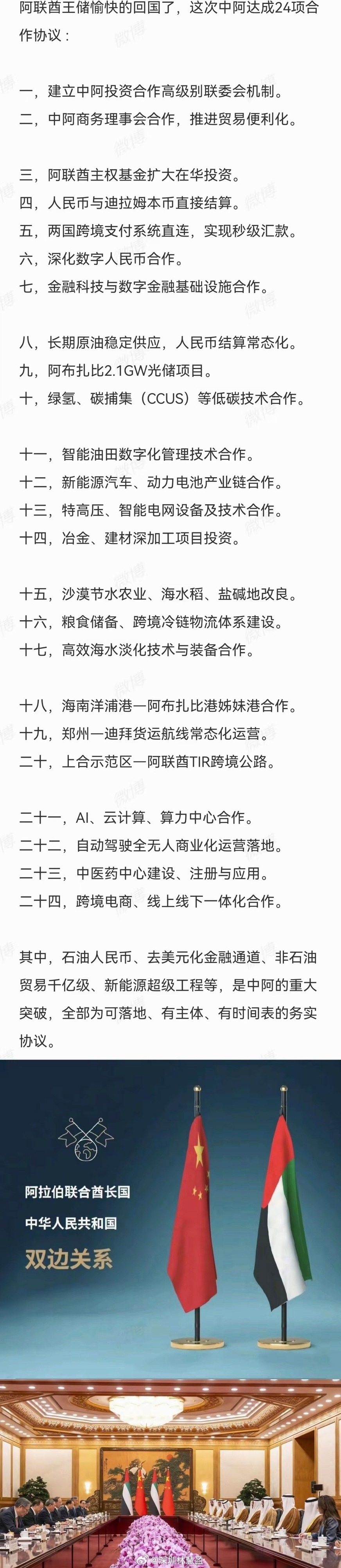 中阿达成的24点协议,我们得感谢美国这次神助攻。不得不说,阿联酋这次也是真正看清楚了世界大局,将国家的未来押宝到我们这边了。而这份协定,彼此互补,阿联酋提供能源,资金以及人民币结算;中国提供阿联酋需要的技术,工程项目,帮助阿联酋现代化。这份协议,几乎和当年沙特何我们签订的协议一致,甚至更优。我一直坚定的认为,中东的石油结算体系以及中东主权基金,决定了世界货币的方向;用美元和投资美元,那美元就是世界货币;用RMB和投资RMB,那RMB距离世界货币就不远。我们都没有想到,RMB破局会这么快;这次中东战争如果结束,后面速度会更快。