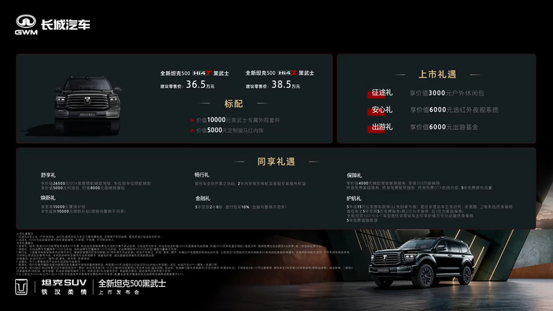 易车讯4月15日,坦克汽车官方宣布全新坦克500黑武士迎来正式上市,新车共推出2款车型,售价区间36.5-38.5万元。新车将延续硬派越野黑武士官改IP,还将采用全黑视觉体系、新增红色内饰。