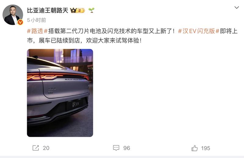 易车讯4月15日,比亚迪王朝网销售事业部总经理路天在社交媒体上宣布,比亚迪汉EV闪充版即将上市。目前该车已经陆续到店,易车编辑也拍到该车的实车图。