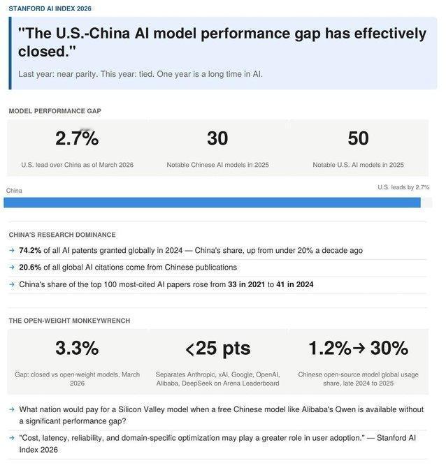 斯坦福报告:中美AI性能差距缩至2.7%,中国开源模式挑战硅谷霸权。