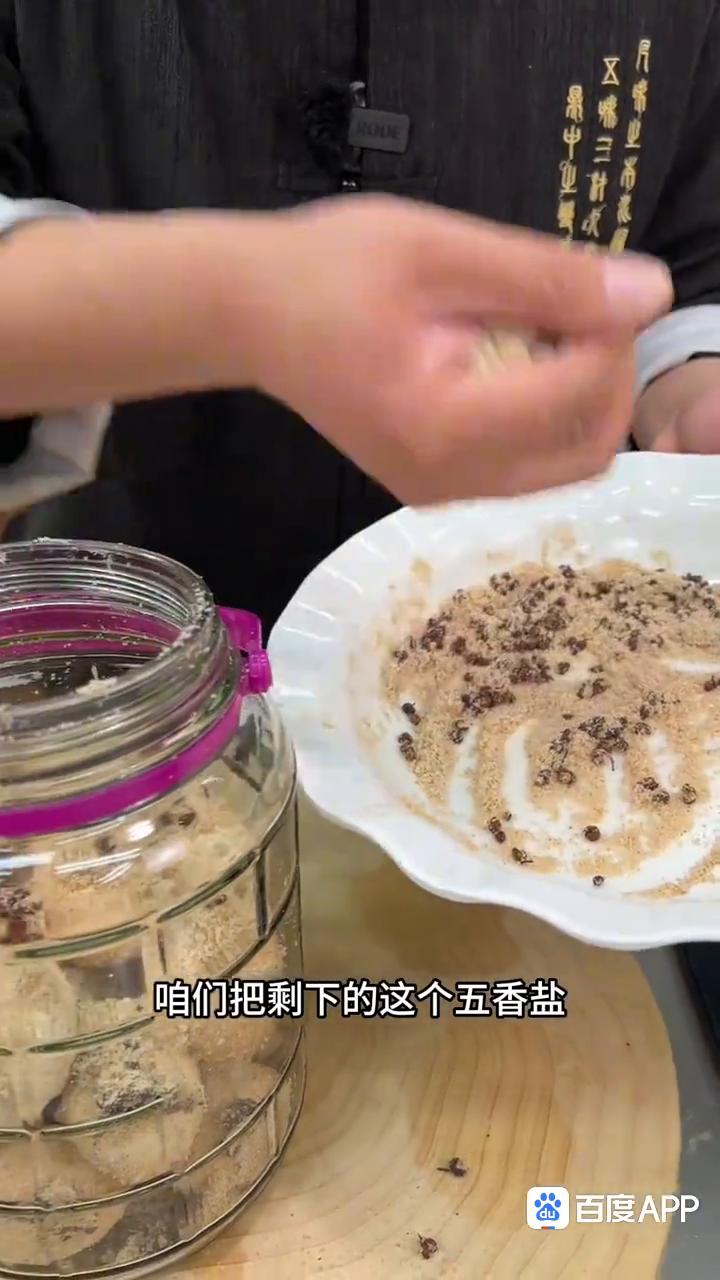 ·把盐炒到这种颜色微微的发黄,香味炒出来了,这个时候把盐和花椒直接倒入大碗中,趁热往里边加入两勺的五香粉。这个五香粉加入以后和刚炒的热盐花椒,给它混合的搅拌均匀,这样五香味很香很浓,腌出来鸡蛋就属于五香腌鸡蛋,五香味的可浓了。