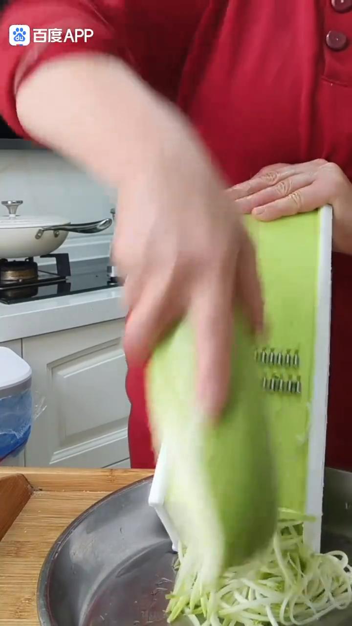 ·然后再把小角瓜擦上细丝,水开了,加点盐,把角瓜丝放进去,迅速的用开水焯一下就捞出来。