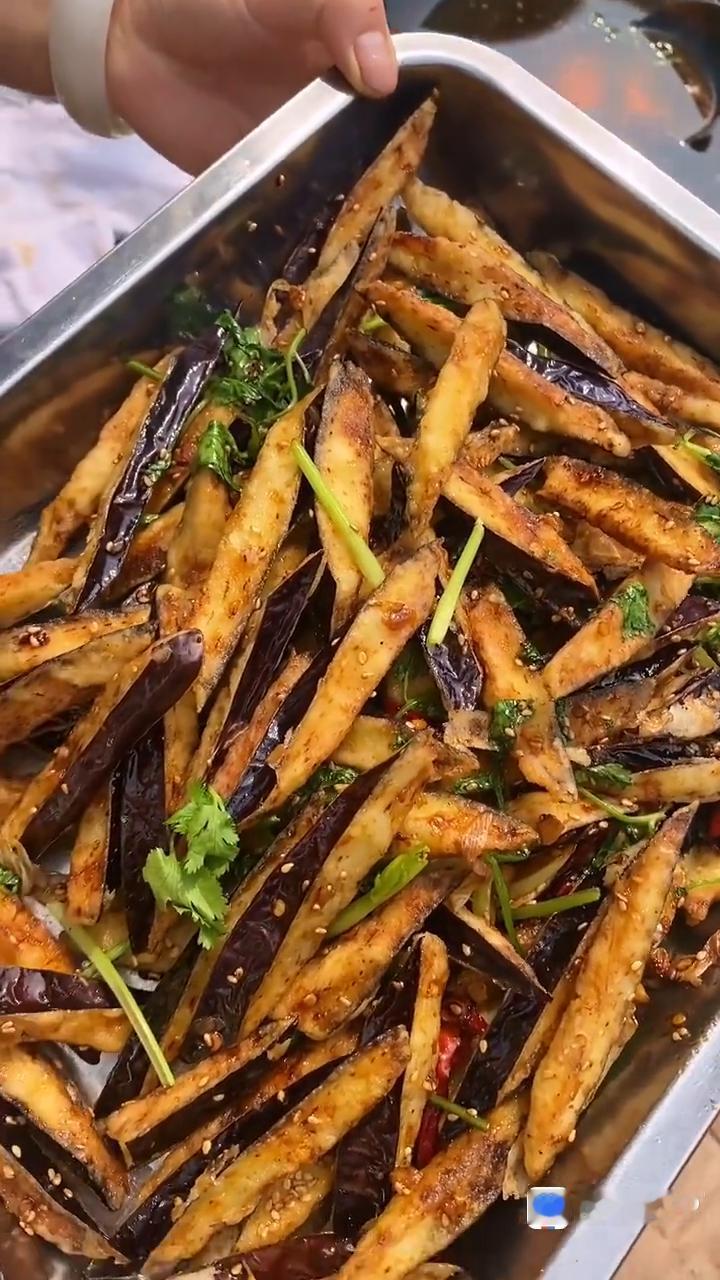 ·每个茄子上均匀的涂上一层粉。你多久没有用大锅台做过饭了?得有30多年。先试一下油温,6成油温下锅炸,第一遍炸微黄捞出来,二次升高二次复炸,炸金黄酥脆捞出来。