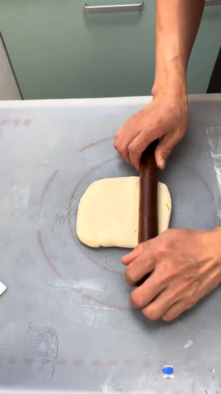 ·再从中间划一刀,重点是这面儿不要划断,然后再从这头儿往前卷,给它叠,叠的层次越多,这个饼的隔层效果就特别好,也就是它的层次也特别多。