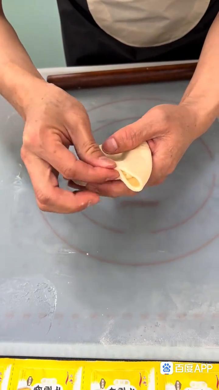 ·封上以后大家看,这个手法就是把这一头儿中间的饼坯给它往里送,然后边缘给它封上,给它捏实。