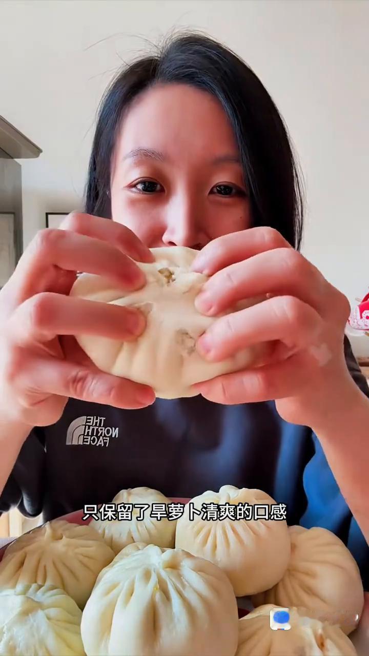 ·包完了第一屉包子以后先得尝一个,你别看这包子是萝卜馅的,蒸熟了掰开以后一点臭萝卜味也没有。因为这个旱萝卜经过炒制以后已经把里面的异味去除掉了,只保留了旱萝卜清爽的口感和淡淡的甜味,口味跟口感老少皆宜。