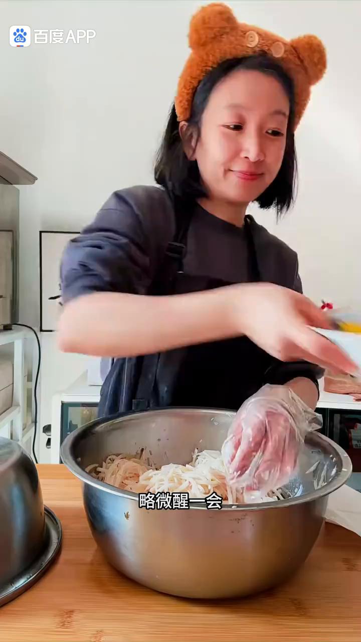 ·接着说这粉丝,粉丝粉条都行。今我放的粉丝,但一定得用凉水泡,千万不能用热水泡。粉丝切的时候得是硬的,粉丝放在素馅里的作用,一个是丰富口感,再有一个是吸汤。如果粉丝泡的太软就起不到作用了。