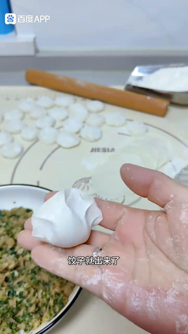 ·皮看,小圆碗碗,这样使饺子皮圆乎了。包饺子包什么样的其实都不会太难看了,要在中间这个窝窝这个位置,时间长了就咔家,馅其实就已经放在这个位置了。