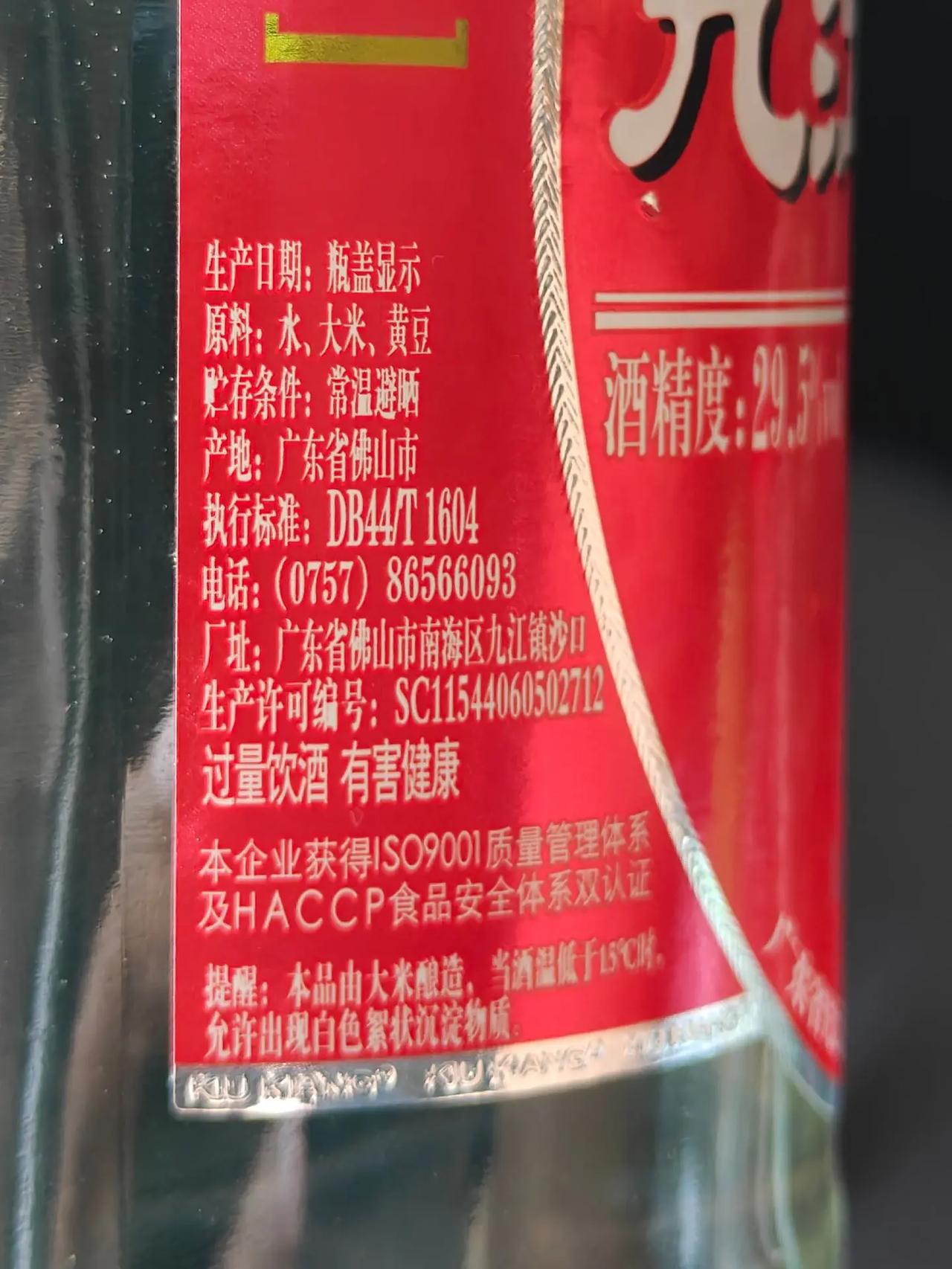 广东省酒,好喝 来到广州必须得尝尝广东省的省酒,名为“九江双蒸酒”,它可不是江西省的九江市产的,而是广东省佛山市南海区九江镇生产的,酒精度只有29.5度。是老婆在广州附近325国道边上的一个小镇上买的,很便宜,只有13元。喝之前我闻了一下,感觉有点像小时候的某种酒味,以为没什么特殊呢,可喝了一口就感觉味道挺好,再喝一口就感觉非常有酒味,还有一点像酱香酒的味道,看酒精度只有29.5度,以为着喝着会很寡淡,可没想到喝起来确很浓郁,我感觉这个酒的味道很奇妙,不知道怎么来描述它,所以就打开豆包擦了一下,豆包上说它是豉香酒,低度而不淡。反正总体来说,我个人认为很好喝,也非常适合我,所以,必须得记录一下这个酒,看介绍,还有42°和43°的双蒸酒,我都要买来尝尝。只是有一样不太满意,酒商标的背面写着,从2017年开始,扫描瓶盖里的二维码就可以兑红包,而且是百分百中奖,可我扫码后,显示的是无法打开页面,这算不算欺骗消费者?大家应说我应该投诉它吗? 广东省酒 九江双蒸 双蒸酒 口粮酒