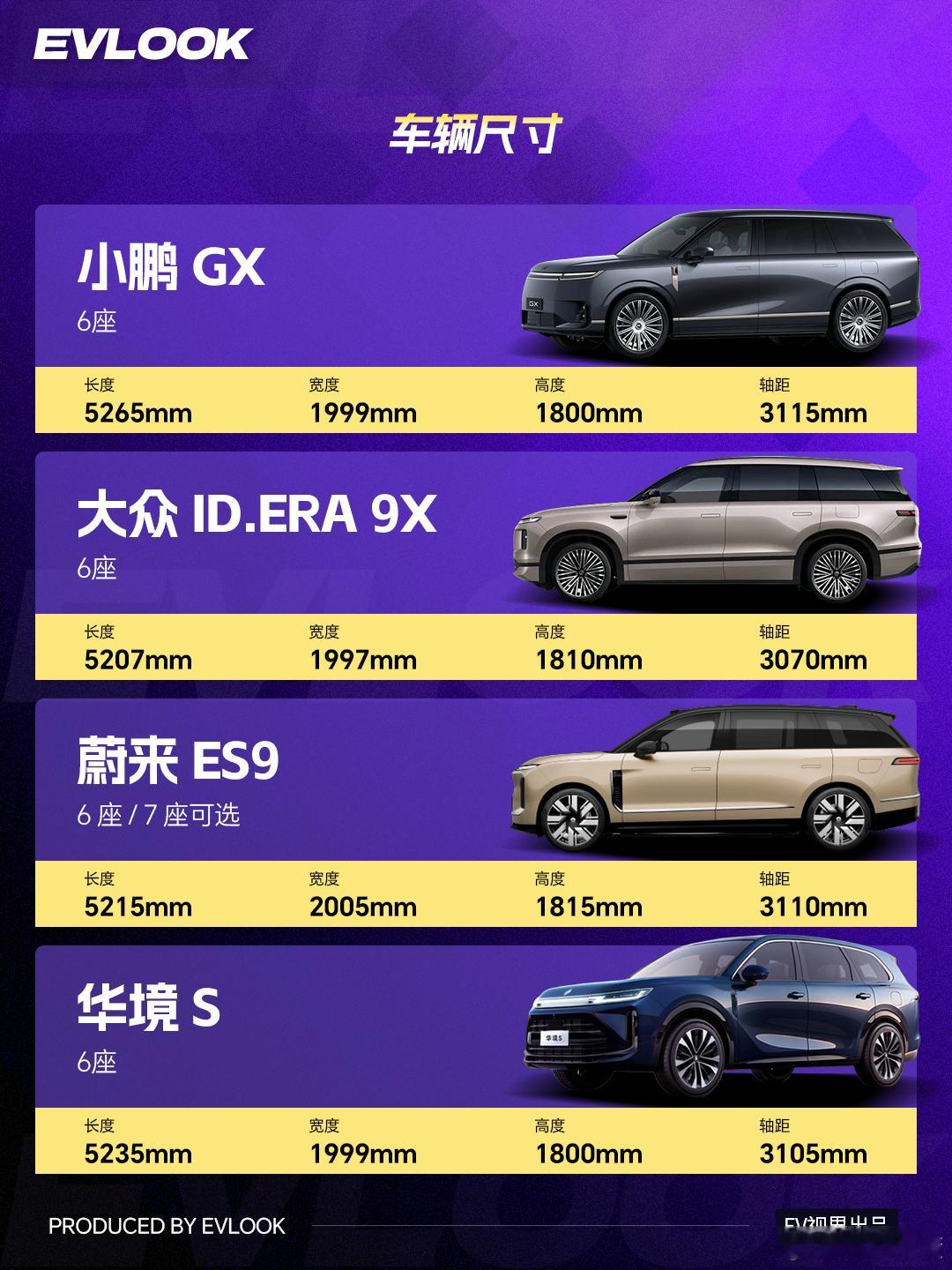尺寸都很能打:华境S车长5235mm最长,小鹏GX轴距3115mm领先,蔚来ES9最宽且可选7座。