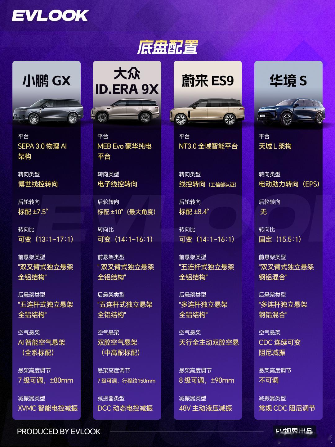 价格覆盖15-65万,各取所需:华境S(15-25万)最亲民,大众(32.98-37.98万)居中,小鹏GX(39.98万)和蔚来ES9(52.8-65.8万)定位高端。