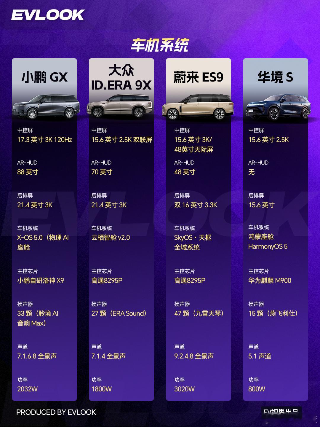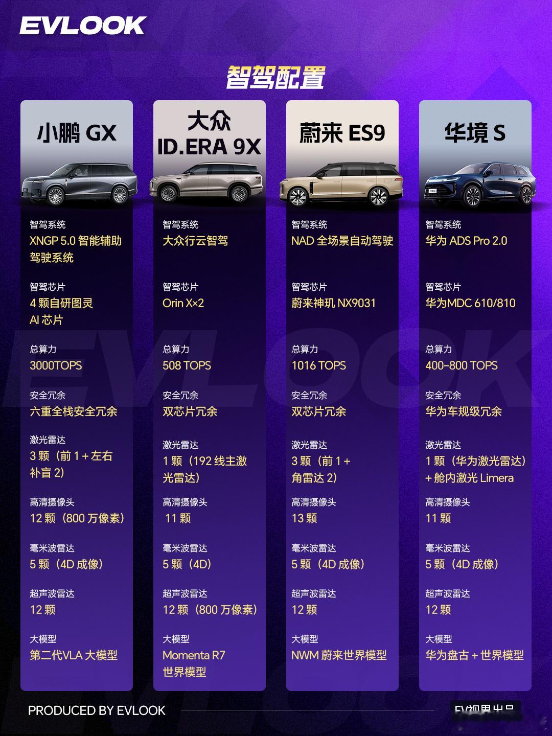 智驾方面,小鹏GX(3000TOPS算力、3颗激光雷达)和蔚来ES9(自研芯片、全场景NAD)最强;大众与华境S满足日常。