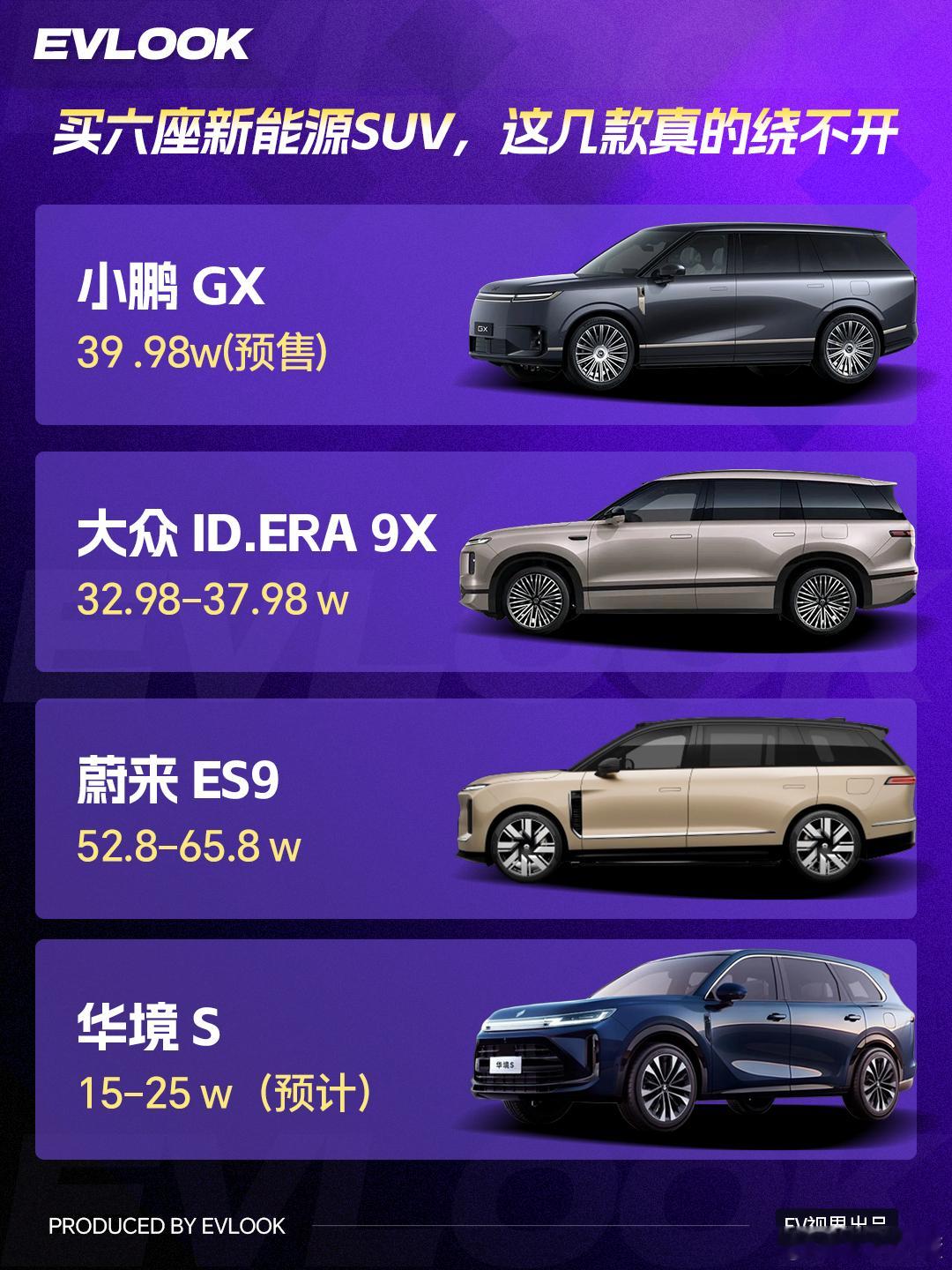 今年六座新能源SUV怎么选?这4款绕不开:小鹏GX、大众ID.ERA 9X、蔚来ES9、华境S。