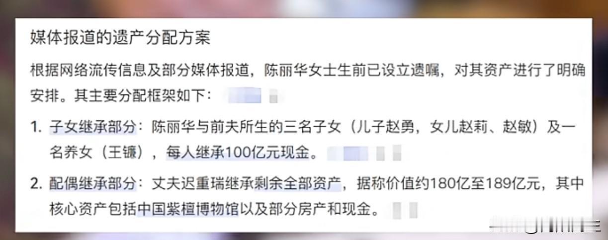 而陪她36年的配偶迟重瑞仅得部分现金和中国紫檀博物馆的继承权及部分房产。