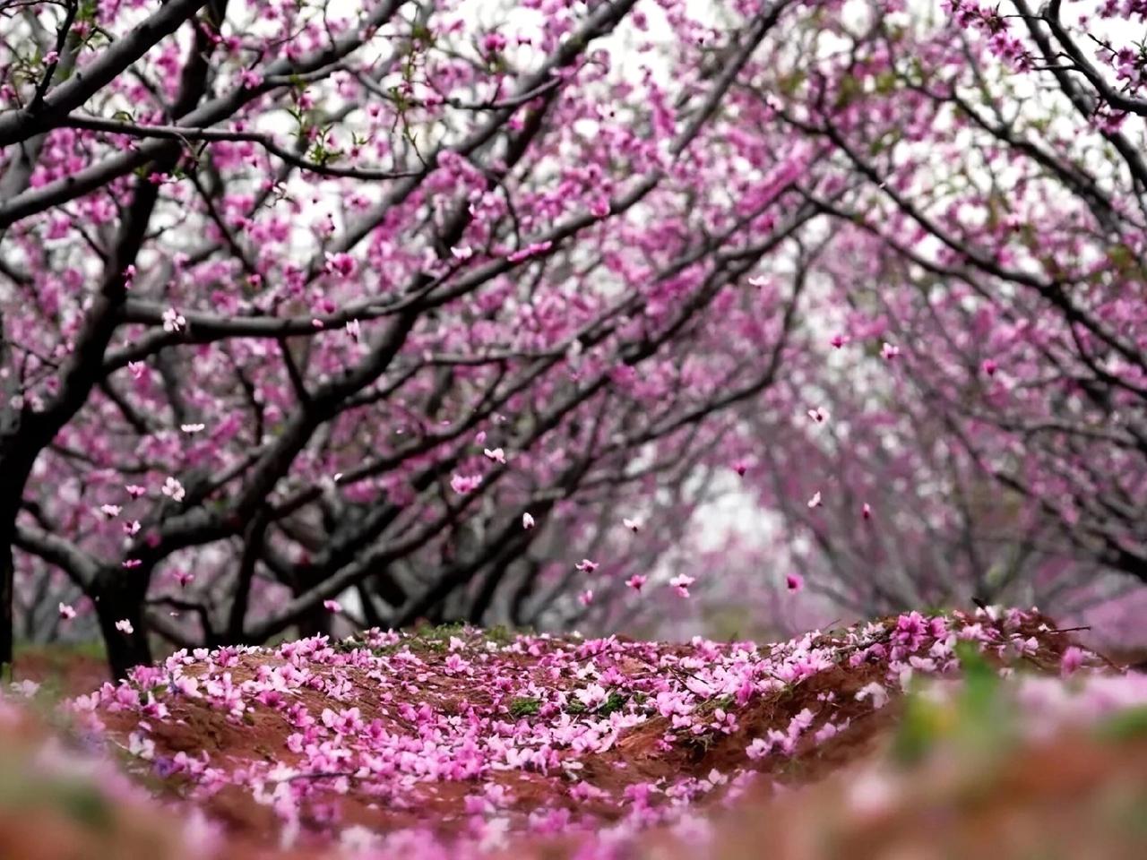 漫步于悠悠桃林,花瓣不时飘落肩头,仿若春天与我亲昵嬉戏。四周空气中满是桃花芬芳,甜润宜人,直抵心脾。