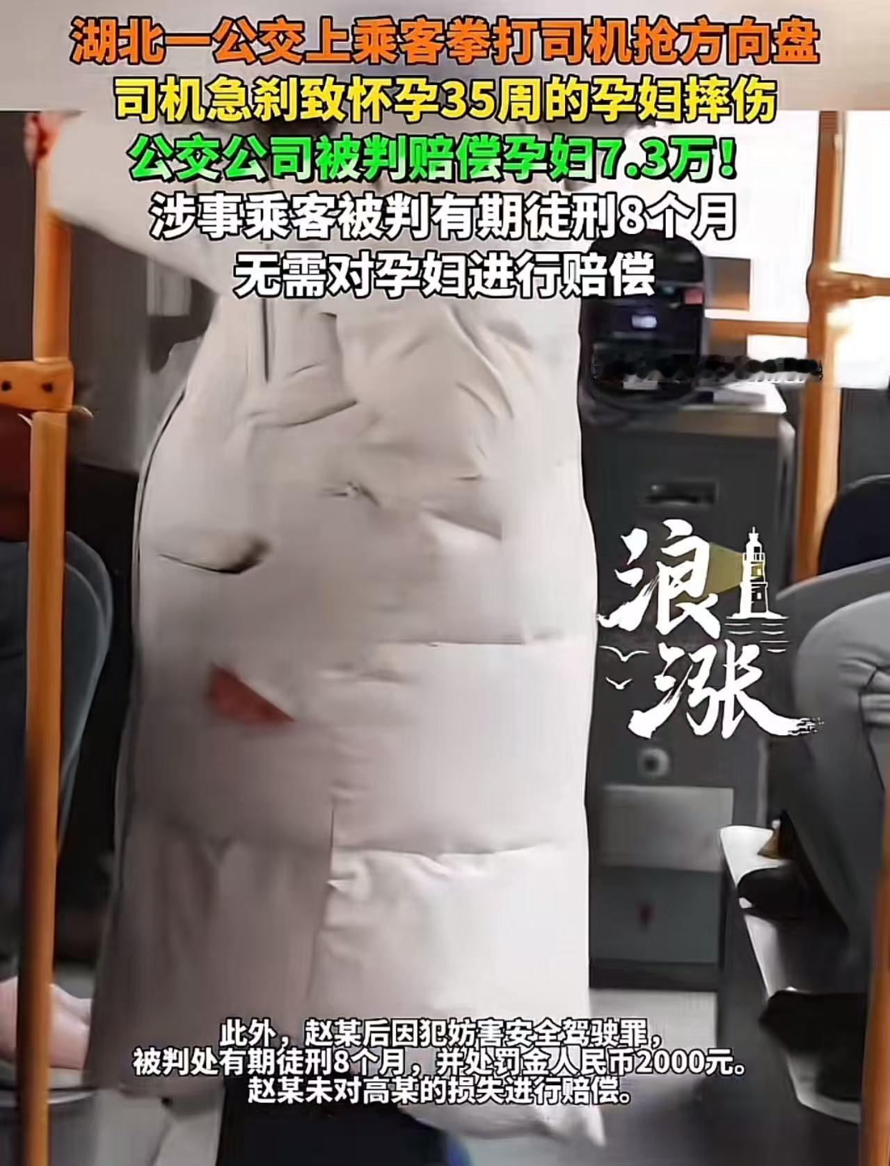 冤不冤?湖北仙桃,一公交上乘客拳打司机抢方向盘,司机急刹导致怀孕35周的孕妇摔伤!公交公司被判赔7万多!