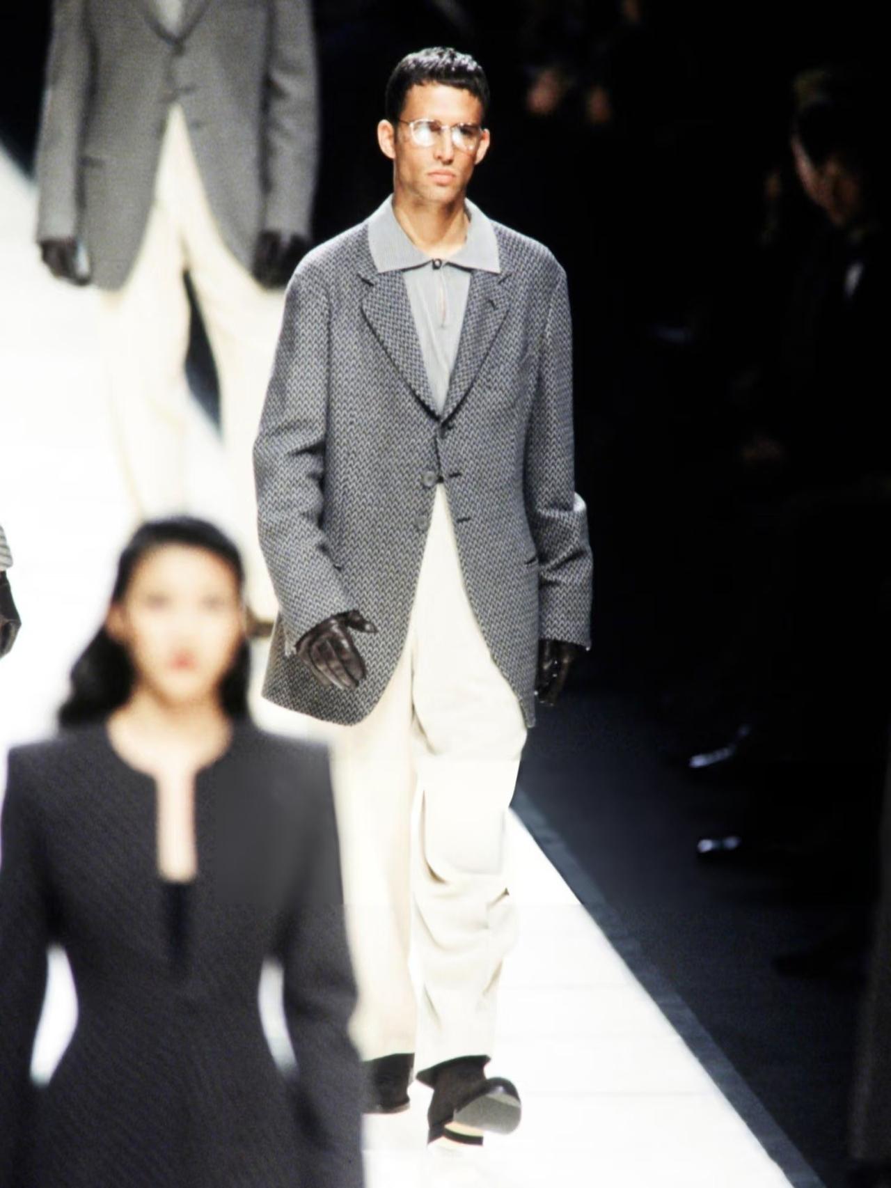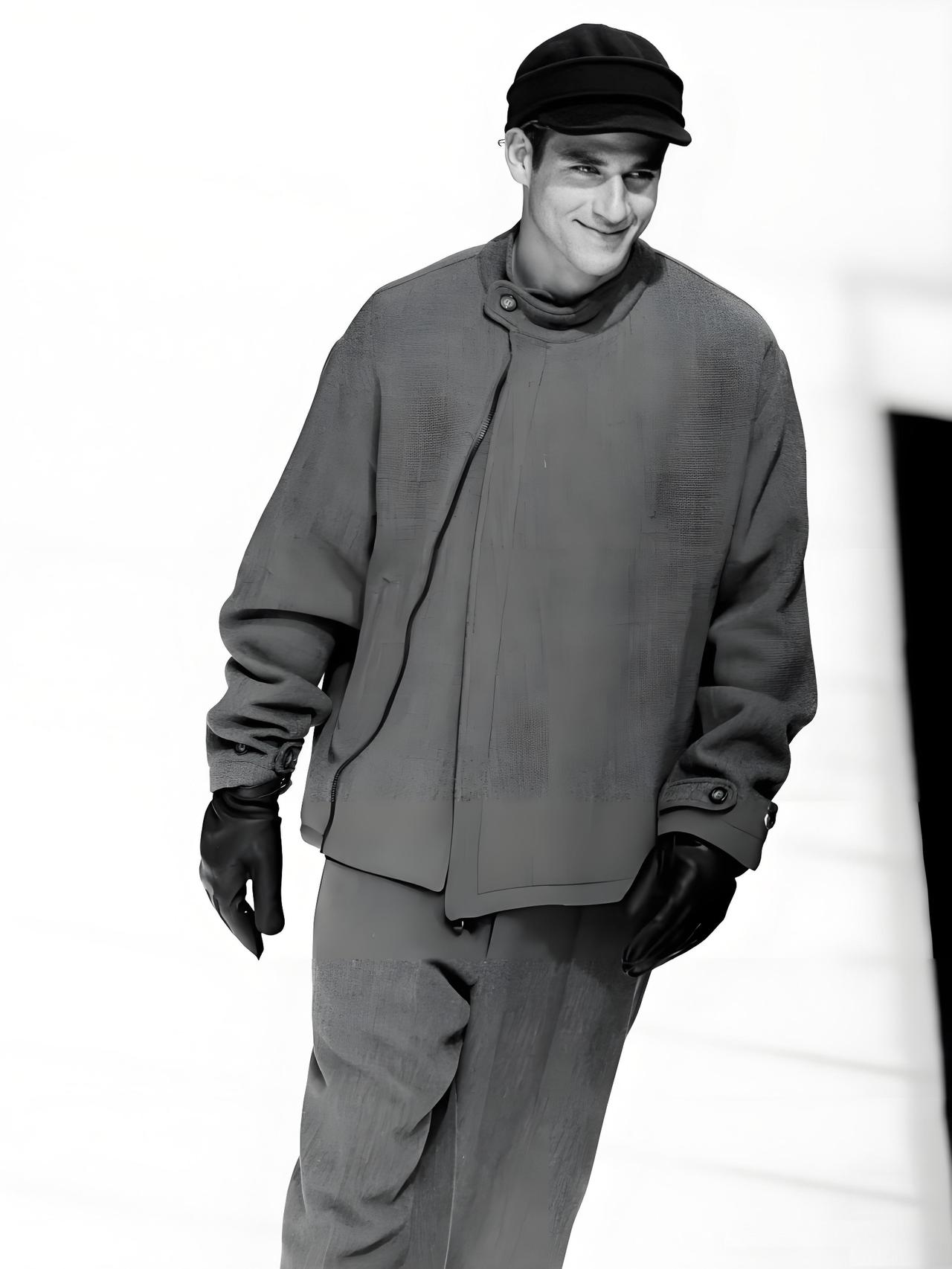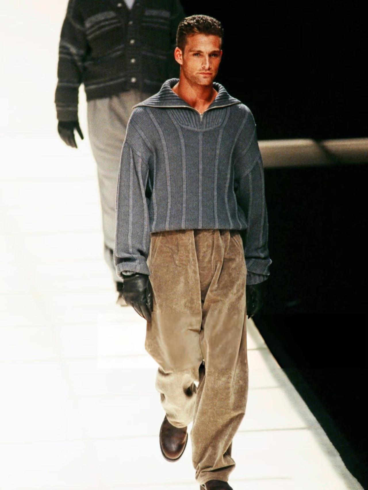 它的顶级之处,首先在于对男性廓形的重新定义。阿玛尼大师打破了传统西装的僵硬和束缚,用柔软的面料和“非结构化”的剪裁,创造了一种全新的男性形象。你看那标志性的宽肩设计,搭配垂坠感十足的阔腿西裤,模特走动间,衣料随身体自然摆动,自成一股流动的气场。
