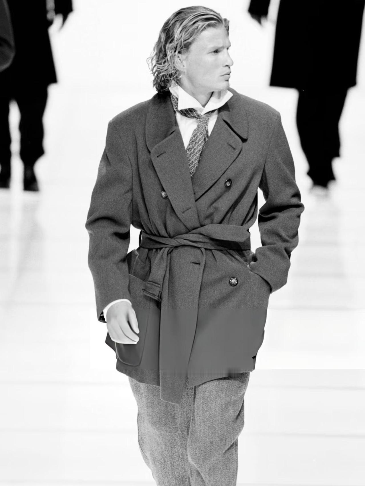 这种上宽下也宽、但整体松弛有度的廓形,完美塑造了优雅的“倒三角”身型,既展现了男性的力量感,又毫不紧绷,充满了从容不迫的权力感。 这不仅仅是时装,更是一种气质的塑造。
