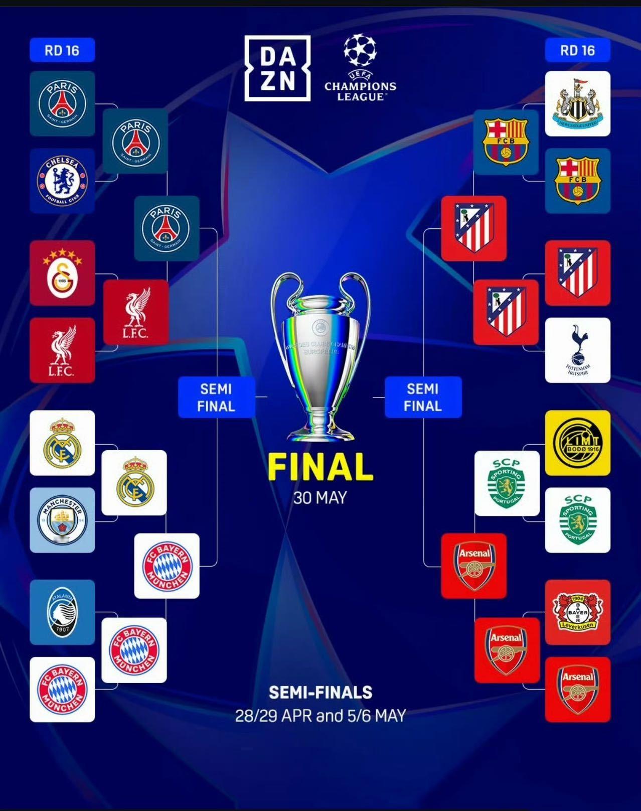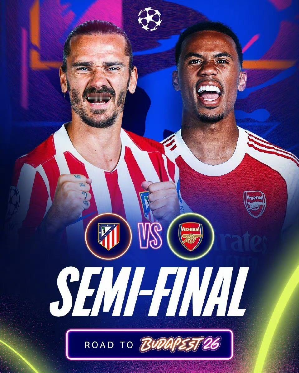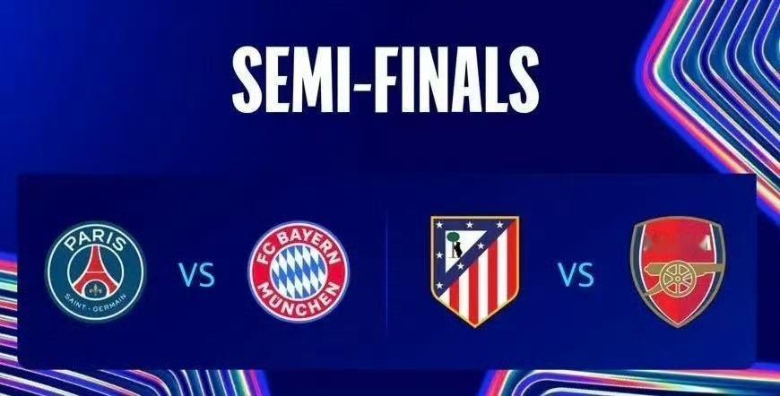 半决赛对阵随之敲定,巴黎将先主后客迎战拜仁,马竞则先主后客对决阿森纳。两回合角逐将于4月29日-30日及5月6日-7日凌晨展开。