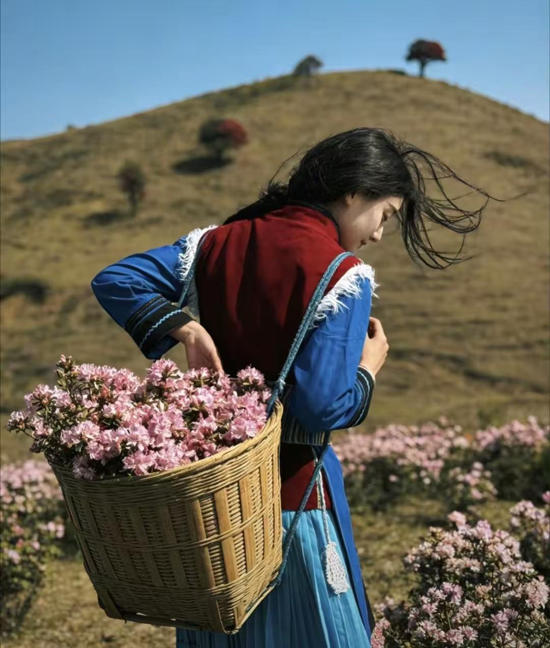 背起花篮去采花,花篮不满不归家。在这春意盎然的季节,如果你还是一个小伙子,你愿意跟这位情窦初开的普米少女一起去采花吗?瞧,这位普米少女简直跟天仙一样漂亮迷人,据说求亲者很多,媒婆都快把她家的门槛踏平了。所以,你若能与这位普米少女一起上山采花,肯定是一件最浪漫、最快乐的事,但愿你珍惜机会,喜得良缘![大笑][赞][玫瑰][鼓掌]