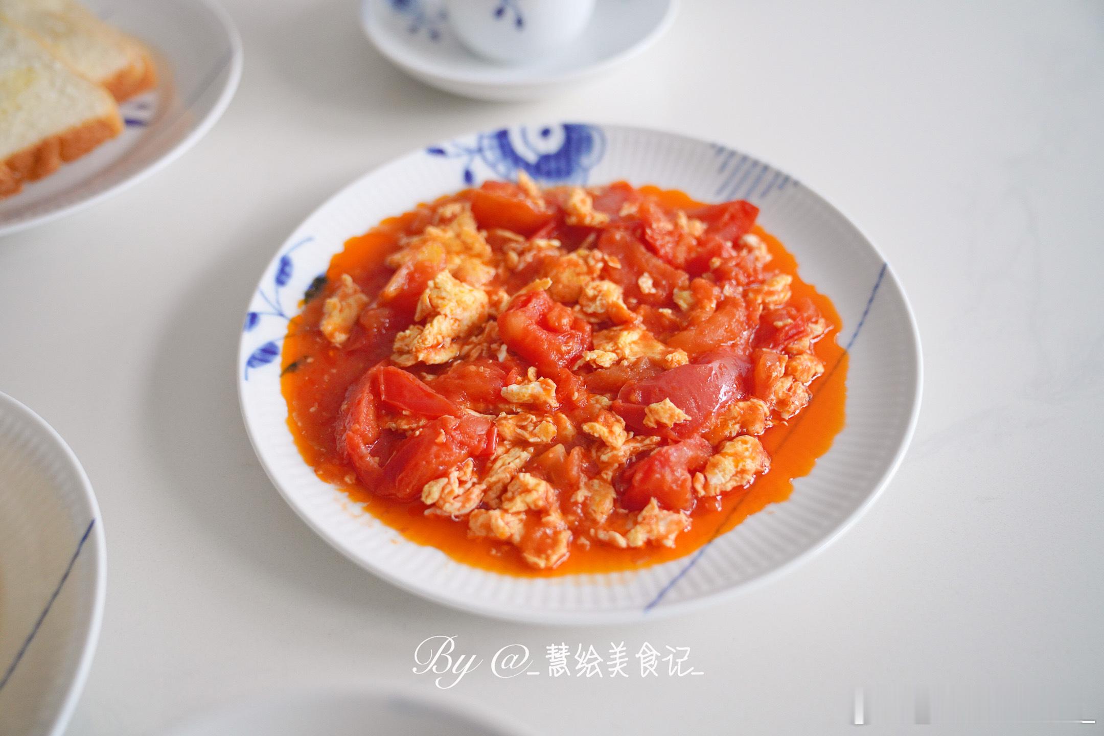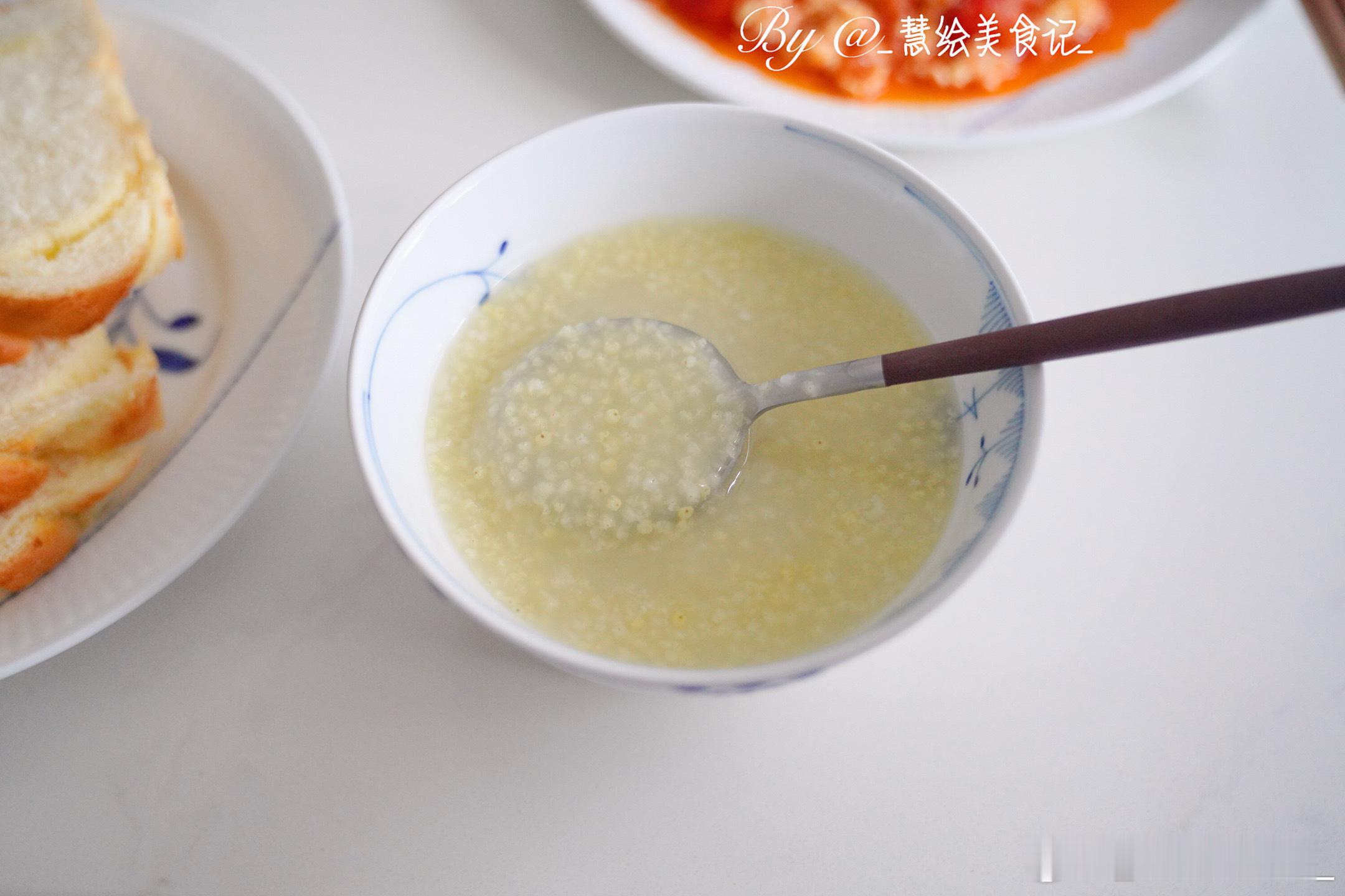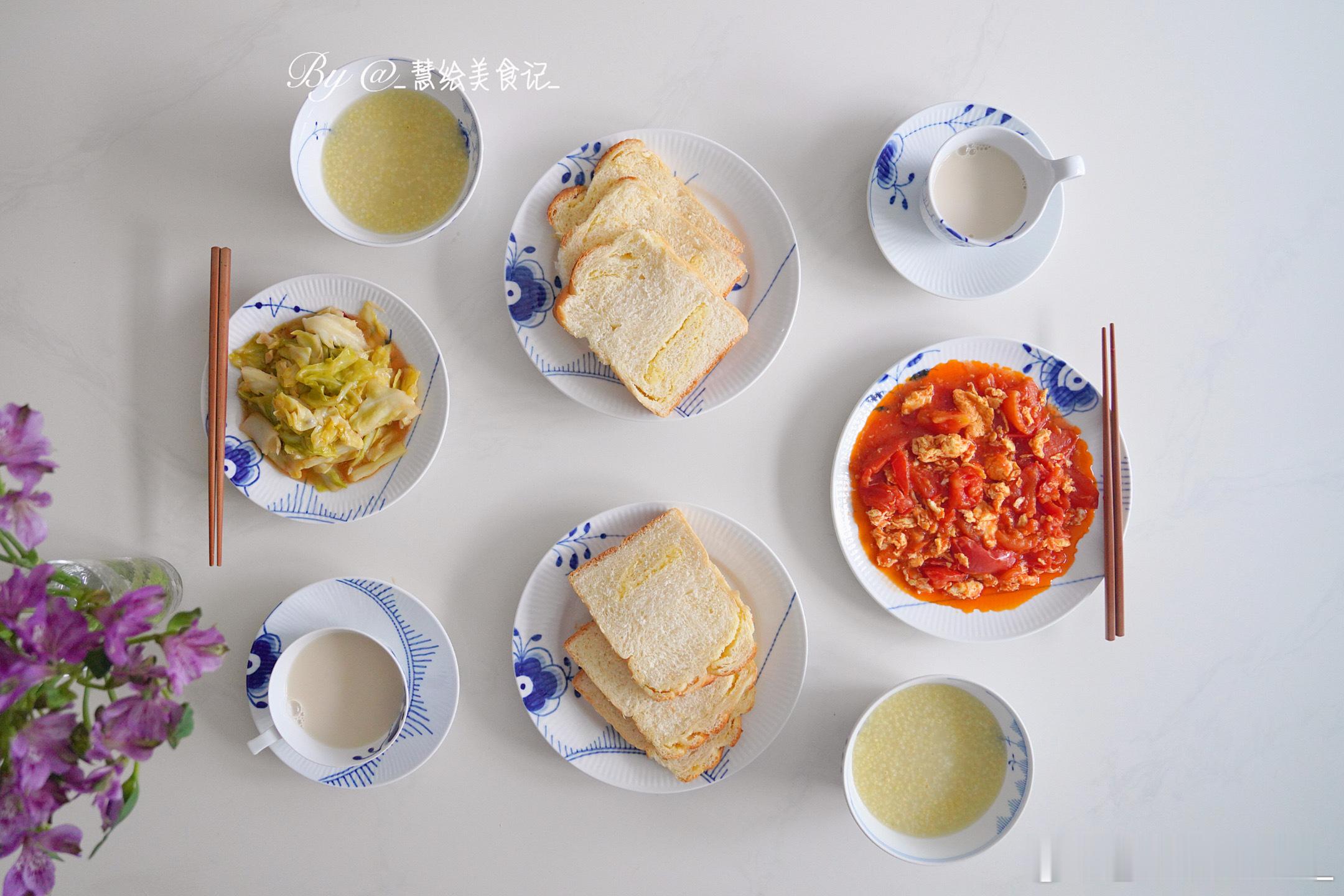 下雨了,有点冷,吃点暖和的~早餐番茄炒蛋、清炒绿甘蓝、小米粥、椰蓉吐司、燕麦奶~我的美食日记