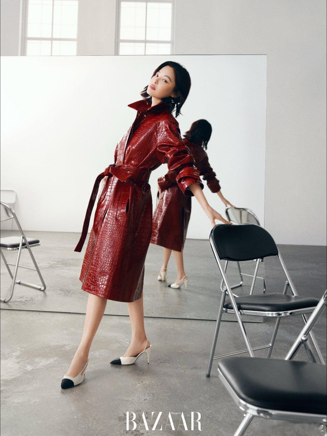 辛芷蕾新造型美炸了!✨酒红真丝V领开衫自带柔润光泽,搭配斜纹花呢半裙,红棕撞