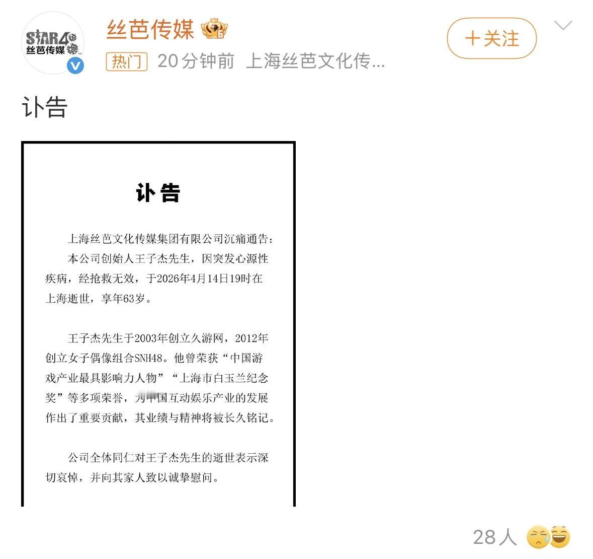 丝芭传媒创始人王子杰猝死,后续公司将由董事长王靖女士带队继续前行。