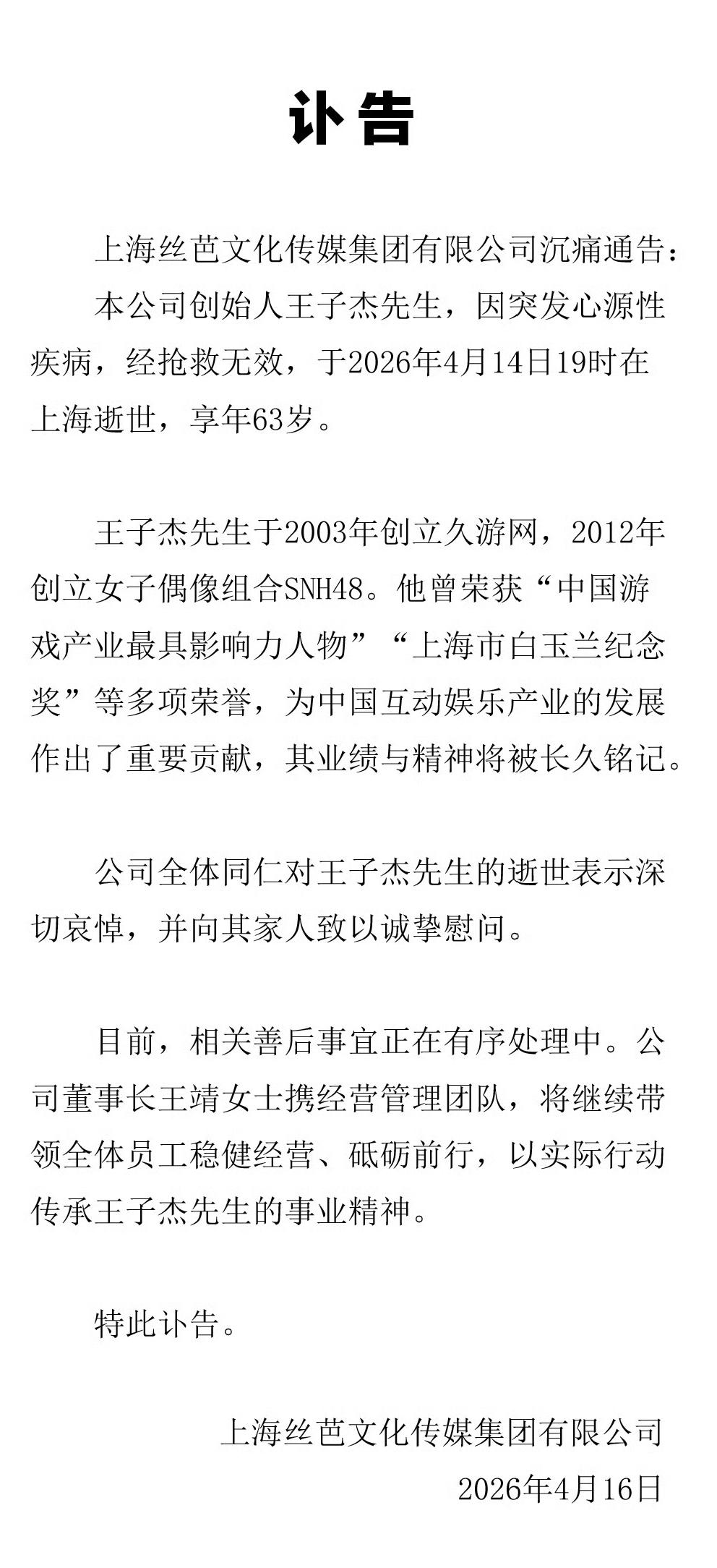 王子杰享年63岁,2012年创立女子偶像组合“SNH48”,开启国内养成式女偶像新纪元。