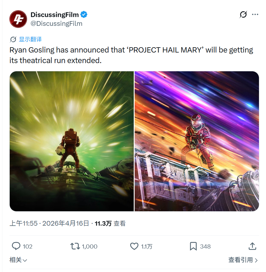 TNABO 因为票房表现太好,主演/制片人瑞恩·高斯林在CinemaCon上宣布《挽救计划》将延长院线窗口期(推测是6月以前都不考虑让影片上数字平台了),感谢大家这段时间送出的支持。
