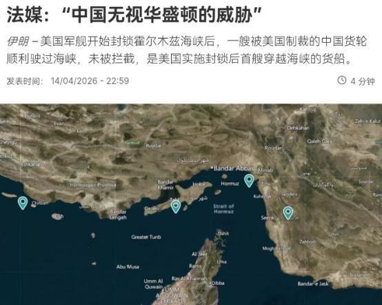 法媒直言:中国无视了华盛顿的威胁!在中国油轮“富星”号通过霍尔木兹海峡之后,4月15日,法新社刊文表示,美国军舰开始封锁霍尔木兹海峡后,一艘被美国制裁的中国货轮顺利驶过海峡,未被拦截,这是美国实施封锁后首艘穿越海峡的货船。而与此同时,他国另外六艘油轮试图通过霍尔木兹海峡,在美军舰的封锁下折返。
