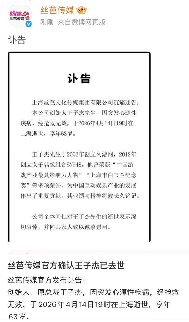 丝芭传媒总裁王子杰去世,又是心源性疾病。都在说今年“丙午年”火太旺,大家注意多休息啊!