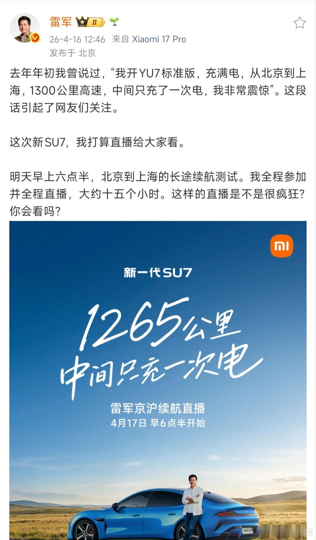 雷军这次又要直播了,而且是北京到上海的长途续航测试,真的有些疯狂。雷总提前爆出路