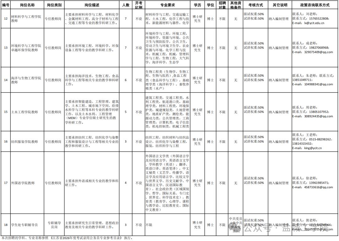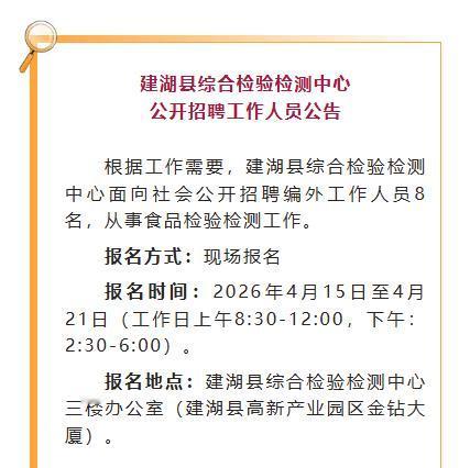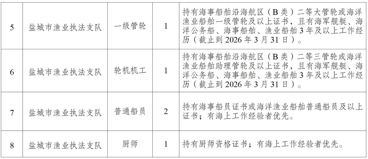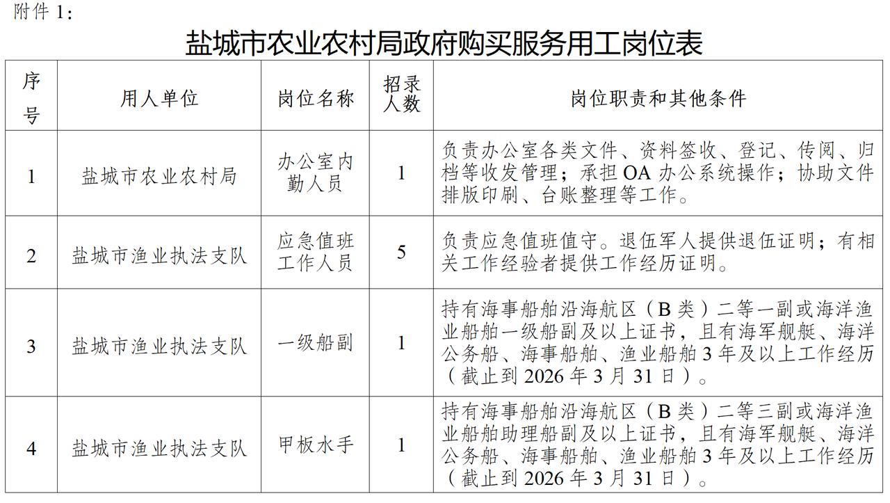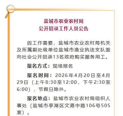 盐城最新招聘信息,包含三个单位:1、盐城工学院2026年第一批专业技术人员实行网上报名;2、盐城市农业农村局及市渔业执法支队招录13名政府购买服务人员;3、建湖县综合检验检测中心招聘8名编外食品检验人员。