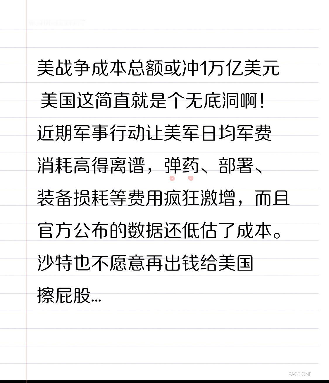 美战争成本总额或冲1万亿美元 美国这简直就是个无底洞啊!近期军事行动让美军日均军费消耗高得离谱,弹药、部署、装备损耗等费用疯狂激增,而且官方公布的数据还低估了成本。沙特也不愿意再出钱给美国擦屁股了。