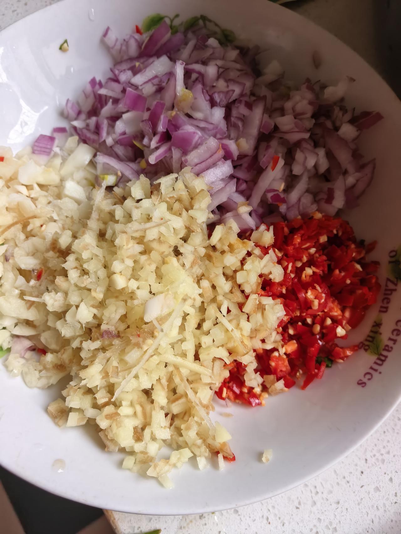 下午回来开始炒酱,按照教程蒜末、姜末、小米辣、洋葱丁,全部就绪后开火,这才发现家里只有一丢丢豆瓣酱,现买来不及,少就少点,三下五除二搞定了。