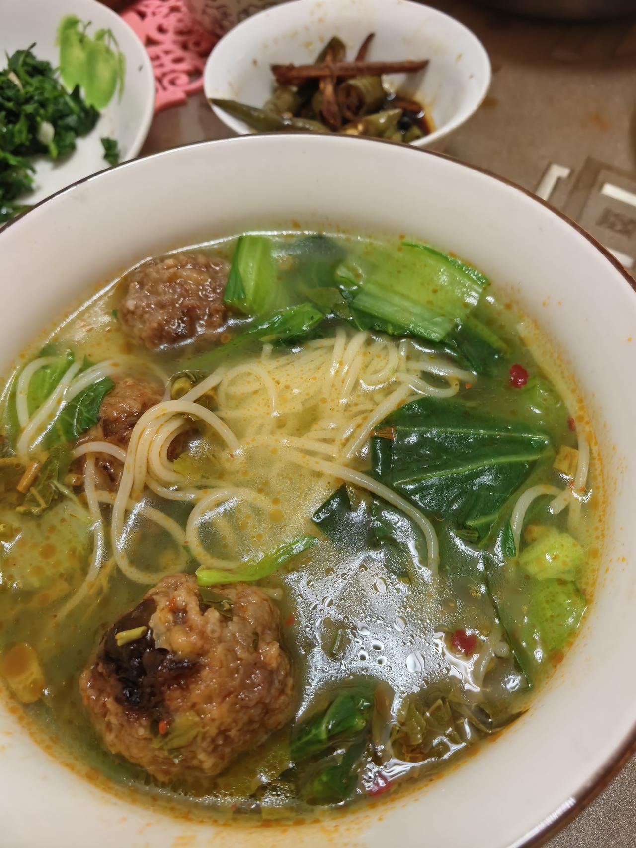 焯好灰灰菜,就势下把龙须面,里面丢几个大肉丸子,然后自家小院拔一棵上海青添锅,完美。
